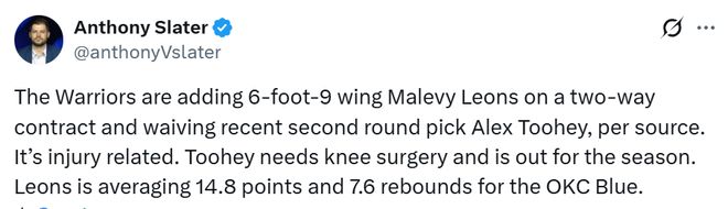 北京时间12月9日,勇士队记Slater报道,消息人士透露,勇士队将签下身高2米06的侧翼球员马莱维-莱昂斯,合同为双向合同,同时裁掉今年的52号秀亚历克斯-图希。据悉,裁员与伤病有关,图希需要接受膝盖手术,赛季报销。莱昂斯目前效力于G联赛的俄克拉荷马城蓝队,场均贡献14.8分和7.6篮板。