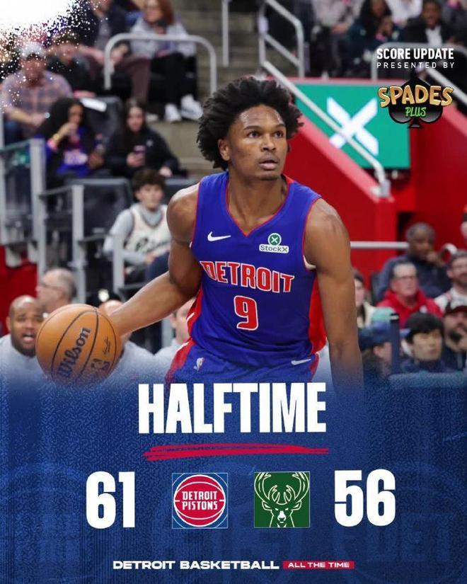 次节比赛,双方进攻火力升级均是单节轰下30+得分,活塞在坎宁安与斯图尔特内外开花引领下,继续压制雄鹿保持领先优势。只是雄鹿也是持续反扑追分,他们上半场已经3人得分上双。前两节比赛,双方均是命中7记三分,雄鹿3人得分上双,小波特8中7得到19分、特纳与库兹马均是12分,活塞2人得分上双,坎宁安15+4+7与斯图尔特13分。活塞单节32-34被追回2分,上半场结束活塞61-56领先雄鹿。