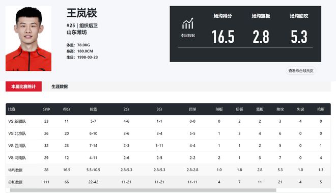 王岚嵚全运会涨球了!三分超五成,单场抢断4个,还能盘活全队!